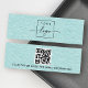 Mini earring product display card with QR code and custom logo template on a aqua blue PRINTED IMAGE of linen. The earring guides can be adjusted by adding and removing spaces in the template field, and by moving the whole element in the design tool.