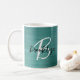 Diese elegante personalisierte Kaffee-Tasse zeichnet sich durch ein Monogramm und einen Vornamen in modernem Schwarz-Weiß-Script auf einem aquamarin blauen, gebürsteten Metall-Hintergrund aus.