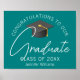 Dieses moderne aquamarine, maßgeschneiderte Party-Poster mit Ihrem Gymnasium- oder Uni-Absolvent für die Klasse 2025. Passen Sie mit Ihrem geschlossen Jahr unter der schicken handgeschriebenen Drehbuch-und Grau Grau-Cap für trendy personalisiert Graduation Party Dekor an.