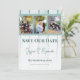 Mit dieser Aquamarinen Holzfoto-Collage kündigen Sie Ihre Hochzeitsfeier Save the Date an Freunde und Familie. Das Design der Ankündigung bietet einen Holzboden und Platz für drei Fotos des glücklichen Ehepaares, das mit einem modernen Textdesign ausgestattet ist.