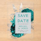 Diese elegante Hochzeitskarte Save the Date mit einem üppigen, romantischen Blumenstrauß in aquamarinem Blau mit silberner Imitat-Foliage auf einem durchsichtigen Hintergrund. Passen Sie den aquamarinen und kohlefreien Text in stilvollen Schriftart auf einem grauen Rechteck an.
