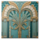 Ein symmetrisches Deko-Fliesendesign mit einem stilisierten Pflanze-Motiv, mit einer Farbpalette, die von aquamarinen und goldenen Farbtönen dominiert wird, ergänzt durch weiße Akzente. Das Design ist in vier quadratische Fliesen unterteilt, die jeweils zum Gesamtbild beitragen. Die obere Hälfte des Designs besteht aus einem halbkreisförmigen Bogen mit strahlenden Linien, der an einen Sonnenaufgang oder einen PfauenSchwanz erinnert und in aquamarin und goldfarben gerendert ist.
