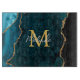 Dieses Schnittboard zeichnet sich durch einen eleganten und glamourösen Marmorhintergrund aus, mit geode gemstone Details und Imitaten goldenen Glitzer Akzente. Das Monogramm kombiniert handgeschriebene Skripte mit modernen serifenlosen Schriftart für ein elegantes und raffiniertes Aussehen. Dies wird das ideale Geschenk, da es mit einem Namen und Initial angepasst werden kann. Die tiefen aquamarinen Blautöne machen es zu einem idealen Ort für Herbst und Winter.