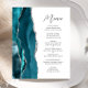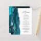 Die links Kulisse dieses eleganten, modernen Hochzeitsmenüs besticht durch ein aquamarines, blaues Aquarelldesign, das mit Imitaten aus silberem Glitzer besticht. Der benutzerdefinierbare Text kombiniert handgeschriebene handgeschriebene Schriftzeichen aus Holzkohle und serifenlose Schriftart auf weißem Hintergrund. Das aquamarine und silberne Agerdesign wird auf der Rückseite wiederholt.