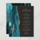 Die links Kulisse dieses eleganten, modernen Hochzeitsmenüs besticht durch ein aquamarines, blaues Aquarelldesign mit vergoldetem Imitat-Glitzer. Der anpassbare Text kombiniert goldfarbenes Handschriftskript und singt serifenlose Schriftart auf schwarzem Hintergrund mit dunkelschiefer Schrift. Das aquamarine und goldene Agerat-Design wird auf der Rückseite wiederholt.