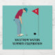 Fröhlicher aquamariner, blauer Golfer, mit einer Kappe, rotem Shirt und blauer Hose, der einen Golfball in ein Loch Design Flaschenetikett steckt. Anpassen des Texts