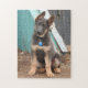 Wunderschöner Blue German Shepherd Welpe gegen aquamarines blaues Holz