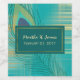 Schick Hochzeitsweinetiketten in voller Größe, aquamarin und goldgelb abstrakt, mit einer schwachen aquamarinen Pfauenfeder, im Hintergrund. Ein aquamariner und goldfarbener Rechteck in der Mitte des Etiketts hat einen goldfarbenen Text. Personalisieren Sie den Text, um zu lesen, was Sie gewollt haben. Ideal für Ihren Empfang Hochzeitswein.