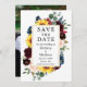 Die moderne Elegant Watercolor Floral Save the Date Card beinhaltet bordeauxrote Rose, rosa Rosen, blaue Blumen, rote Blume, Sonnenblumen, Eukalyptus-Blätter und botanisches grünes Blattwerk auf einem goldenen Rahmen. Foto zurück.