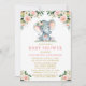 Aquarellfarben Rosa Weiß Blütenweiß Blütenbaby Elephant Baby Dusche Einladung. Freuen Sie sich auf die rosa Aquarellrosen, die weißen Blume und die botanische Vegetation. Gold Text.
