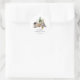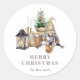 Diese gemütlichen, rustikalen Ferienaufkleber zeigen eine Aquarellbilder einer niedlichen weiblichen Gnome, die neben einem Miniatur-Weihnachtsbaum, einem Korb aus Birkenholz und einigen Kerzen sitzt. Die Wörter "MERRY CHRISTMAS" erscheinen in grauen Serifenbriefen, die sich mit der Kunst abstimmen.