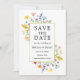 Die moderne Watercolor Wildblume Wedding Verlobung Announcement Save the Date Card beinhaltet zarte, gelbe, rosa, pfirsichblaue, staubige, schlaue, lila, rote und orangefarbene Blume, Pfeffer, Eukalyptus-Blätter und andere wunderschöne botanische Pflanzen auf einem goldenen Rahmen. Ein paar Foto zurück.