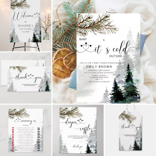С druckten Baby Dusche Einladungen in einer hübschen, geschlechtsneutralen Farbpalette. Dieses süße Design besticht durch einen Wald mit immergrünen Wasserbäumen с Weihnachtsbaumzweig und moderne handgeschriebene Schrift, in der Baby It's Cold Outside steht - perfekt für ein rustikales Thema der Babydusche im Winter. Personalisieren Sie es mit Ihren Veranstaltungsdetails für kleine Jungen oder Mädchen.