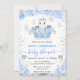 Eleganter arktischer Polar-Bär in einem Sleigh-Design mit Geschenken, blauen Blumen, silbernen Glitzer-Konfetti und Schneeflocken mit blauem Streifen Hintergrund