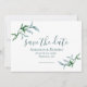 Eine Rett-The-Date Wedding Announcement Card ist mit weichen, blumengeschmückten Zweigen in Blau- und Grüntönen auf weißem Hintergrund konzipiert. Der erste Text enthält: Rett-The-Date, die ersten Namen von Braut und Bräutigam, Hochzeitstag, Hochzeitsplatz und förmliche Einladung zum Nachfolgen. Um eine persönliche Note zu erhalten, ersetzen Sie einfach den Beispieltext mit unserer einfachen Vorlage, indem Sie das Beispiel ersetzen.