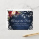 Moderne Elegante Wasserfarbe Burgundy Marsala Floral Change The Date Wedding Postponement Postcard bietet bordeauxfarbene Rose, rosa Rosen und grüne Vegetation auf rustikalem blauen Holz mit Maurerkirschen Saitenleuchten und Spitzen.