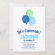 Jolie invitation à l'anniversaire de ballon pour un petit garçon. Ce design présente des ballons d'aquarelle peints à la main en bleu, bleu marine et vert.