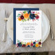 Lumineuse, aquarelle, multicolore, bordure florale en haut à gauche et en bas avec une base blanche sur le devant et modèles mariages en bleu foncé.