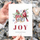 Cette carte postale de vacances confortable présente une aquarelle illustrant un cardinal rouge perché au sommet d'une collection de cadeaux de Noël emballés dans un cadeau et entourée de verdure sainte et métisse et de flocons de neige bleus stylisés. Le mot "JOY" apparaît dans de grandes lettres rouges et muettes qui s'harmonisent avec l'art. Ajoutez le nom de votre famille et l'année en italique gris-fusain, et votre adresse de retour sur le dos.