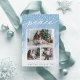 Partagez vos salutations de vacances avec ces cartes photo de Noël chic avec trois de vos photos préférées (1 paysage, 2 carrés) disposées dans un plan rectangulaire sur un arrière - plan de lavage à l'aquarelle bleu pâle accentué par la chute de neige. "Paix" apparaît en haut dans une élégante typographie manuscrite. Personnalisez avec votre salutation de vacances personnalisée, nom(s) et l'année le long du bas. Les cartes retournent à un motif rayé en bleu pastel et blanc assorti.