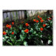 Conception graphique d'aquarelle de Debbie Hupp. tulipes Rouge-oranges par la barrière. Masquez l'intérieur pour vos mots.