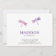 Une jolie et moderne invitation à la fête d'anniversaire avec des libellules d'aquarelle violette, et texte d'invitation en violet et gris. Le soutien de l'invitation est en violet.