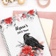 Ce planificateur de calendrier gothique a votre nom monogrammé dans un script cursif moderne et des illustrations d'aquarelle d'un corbeau mystérieux et de roses rouges sur un arrière - plan blanc. Vous aimerez ce corneille noire, design imaginaire fleuri. Des articles de coordination sont disponibles dans notre boutique.