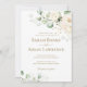 Une invitation de mariage douce et élégante avec des roses blanches d'aquarelle et une verdure délicate, parfaite pour des fêtes classiques, d'inspiration jardin ou romantiques avec une touche raffinée.