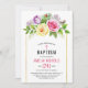 Bouquet de roses d'aquarelle printemps et été fleurie invitation Baptême. Il présente un magnifique bouquet de roses et de feuilles roses, jaunes et lavande et une bordure en feuille d'or. Le dos est de couleur vert foncé.