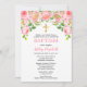 Elégante aquarelle rose vif rose floral bébé fille Baptême design d'invitation avec des fleurs dans un bouquet de type swag haut entourant les détails de votre bébé doux. Une croix de trinité dorée se trouve sous le motif floral, et le fond est un arrière - plan rose marbré. Ce design floral composite est réalisé par Holiday Hearts Designs (droits réservés).
