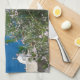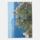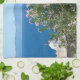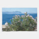 Aquareller Meerblick mit blühenden Blume, weißer Glockenturm und Blick auf das Meer und die Berge auf der griechischen Insel