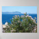 Aquareller Meerblick mit blühenden Blume, weißer Glockenturm und Blick auf das Meer und die Berge auf der griechischen Insel