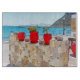 Aquareller Meerblick mit bunten Blume in roten Töpfen und Steinmauer auf einer griechischen Insel
