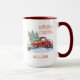 Brauchen Sie eine niedliche Weihnachtskaffee? Probieren Sie diese coole Weihnachtsakzent-Tasse mit einem karierten roten und schwarzen Büffel-LKW, der eine schneebedeckte Straße hinunter fährt und Weihnachtsbäume trägt. Roter Weihnachtstext und personalisierter Namenstext. Ideal für ein Retro, Vintages Urlaubseffekt. Unisex Design für Männer und Frauen. Geeignet für Kinder und Erwachsene.