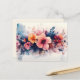Ein breites, abstraktes Aquarelldesign mit einer lebhaften Auswahl an rosa, orangefarbenen, roten und blauen Blumen und blauen Blättern, künstlerischen Glanz und Tropfen von Farbe auf einem hellen Hintergrund.
