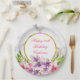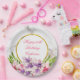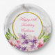 Peronalisierte Teller zum Geburtstag mit modernem Design - ein Imitat mit weißer Marmorstruktur bildet den Hintergrund. Oben platziert ist ein Rahmen mit einem goldenen Rahmen für Imitate. Große rosa und lila magnolische Blume mit grünen Akzenten zieren das Design.