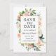 Die elegante Watercolor Rosa Blush Floral Wedding Verlobung Announcement Save the Date Card beinhaltet wunderschöne rosa Rosen, weiße Blume und botanisches Grün. Goldrahmen. Foto zurück.