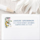 Das moderne Watercolor Wildblume Wedding Return Label beinhaltet gelbe, rosa, lila, staubblaue und weiße Blume, Eukalyptus-Blätter, Salbei-grüne Blätter und andere botanische Pflanzen. Blauer Text.