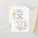 Moderne Watercolor Wildblume Hochzeit Hochzeit Verlobung Ankündigung Save the Date Postcard beinhaltet delikate gelbe, rosa, pfirsichblaue, staubige, schlaue, lila, rote und orangefarbene Blume, Pfeffer, Eukalyptus-Blätter und andere schöne botanische Vegetation auf einem goldenen Rahmen.