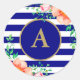 Fügen Sie dem Alltag eine Touch Luxus hinzu mit diesen schicken, runden Aufklebern mit marineblau-weißen Streifen, einem marineblauen Kreis mit goldenem Rahmen und goldfarbenem Monogramm, geschmückt mit schönen, reich rosa Aquarellfarben-Rose und Blattwerk. Macht auch ein tolles Geschenk!