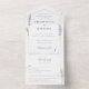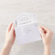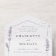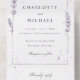 Alles in einer dreiseitigen Hochzeitseinladung mit Aquarelllavender. Hochzeitseinladung, rsvp Karte und Umschlag Kombination. Die Antwortkarte ist eine perforierte Abreißkarte von rsvp mit detaillierten Wahlmöglichkeiten.