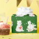 Niedliche Aquarellbären mit Weihnachtsschmuck, Schlitten, heiße Schokolade und Geschenke in Schneeflocken auf grünem Hintergrund. Die Hintergrundfarbe kann geändert werden.