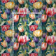 Blume schneiden dauert nur ein paar Tage, aber ein wunderschönes Aquarellbild mit farbenfrohen Tulpen wird viel länger dauern. Dieses mehrfarbige Tulpenfeld in voller Blüte hat einen dunklen Hintergrund und lebendige Blume.