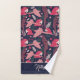 Ara Parrot Tropical Muster Zeichnend Monogram Name Bath Handtuch Set. Ara-Muster auf dunkelblauem Hintergrund mit tropischen Blätter in Grün, Rot und Beige mit einem Namen in rosa Schrift. Ideal für Papageienliebhaber und Papageienbesitzer. Fügen Sie Ihren Namen oder Monogramm Die Handtücher sind auch mit dem Muster erhältlich - öffnen Sie die Sammlung unten.