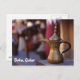 Eine Kaffeekanne vor einer katarischen Flagge in Doha's beliebtem Souq Waqif. Eine Kaffeekanne symbolisiert den Empfang in der gesamten arabischen Welt.