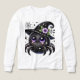 Une araignée noire moelleuse avec un casquette sorcier étoilé, des yeux violets et un accent floral. Charme d'Halloween fantastique pour les enfants et les amateurs d'imaginaires, idéal sur les tee - shirts et les sacs.
