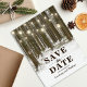 Cartes postales "Rustic christmas wonderland save the date" représentant un cadre romantique de forêt enneigée en hiver, guirlandes lumineuses, cœur sculpté dans le tronc d'un arbre, vos initiales et un modèle moderne de faire-part de mariage.