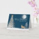 Pin de Noël blanc aux cloches d'or, cerf et oiseau portant foulard d'hiver. Nuit bleu ciel et flocon de neige superposé avec pleine lune pour Joyeux Noël et heureux nouvel an. Le texte est modifiable.