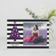Cet arbre de Noël gothique avec carte Stripes vous propose un endroit pour votre photo préférée, un arbre de Noël violet avec crânes contre un arrière - plan à rayures noir et blanc. Customisez avec votre nom et votre année à l'avant avec une chambre supplémentaire à l'arrière pour votre message de vacances.
