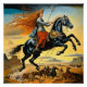 Die A.I. erschuf Interpretation der in aufwändigen Rüstungsfahrten gekleideten Johanna von Arc auf einem majestätischen schwarzen Pferd heftig durch eine surreale Schlachtszene. Ihr orangefarbener und roter Kap fließt im Wind dramatisch zusammen mit ihrem feurigen roten Haar, während sie eine Ladung mit einem erhabenen Schwert führt.